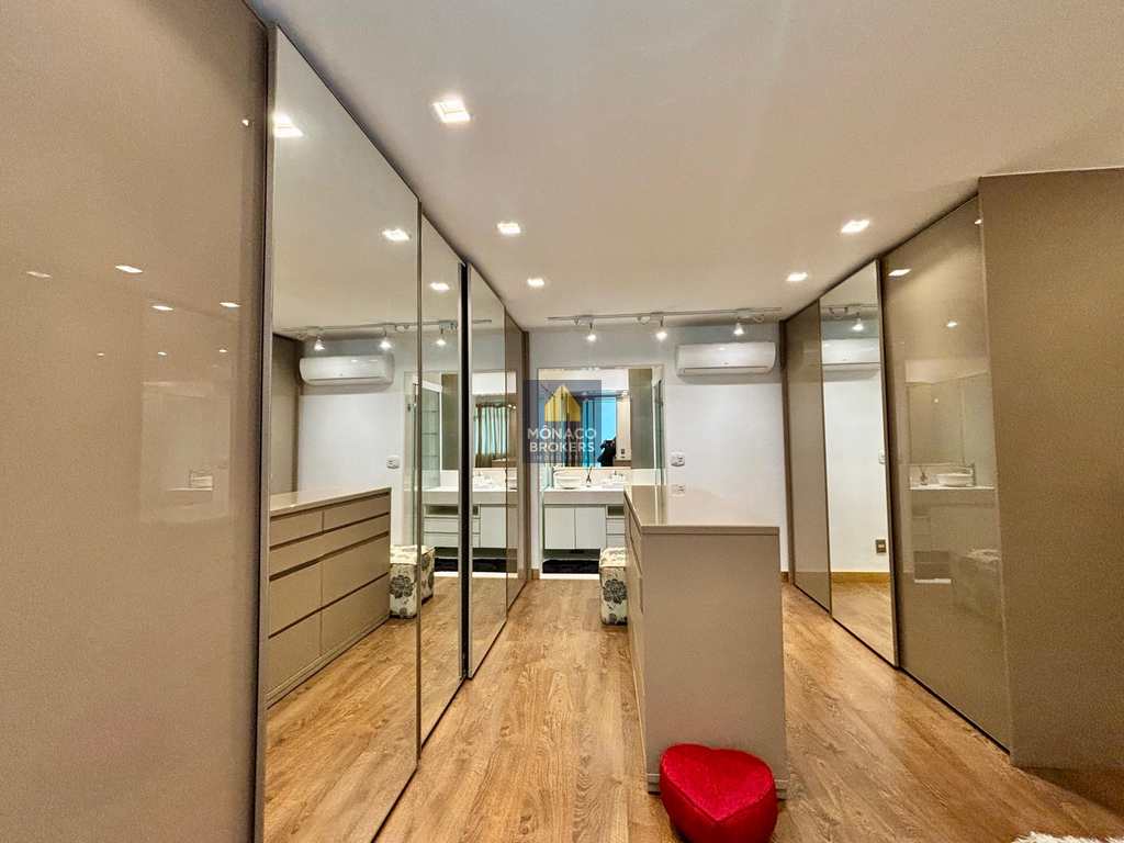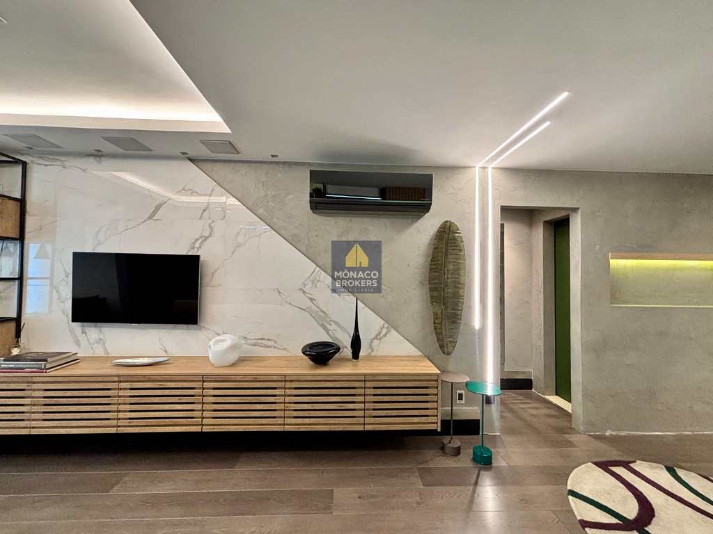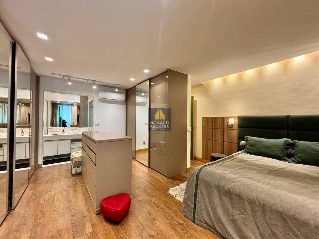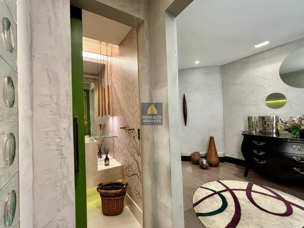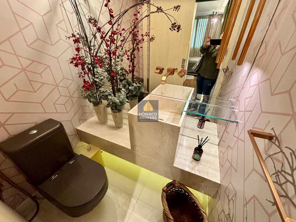A marcenaria sob medida em alto padrão se harmoniza com a iluminação cuidadosamente planejada, destacando obras e peças assinadas que compõem a decoração. A cozinha moderna, equipada com eletros premium, traduz praticidade e beleza no dia a dia. E o lavabo… um verdadeiro charme, digno das melhores referências de interiores contemporâneos.
