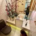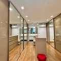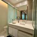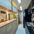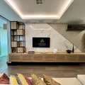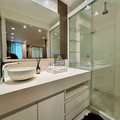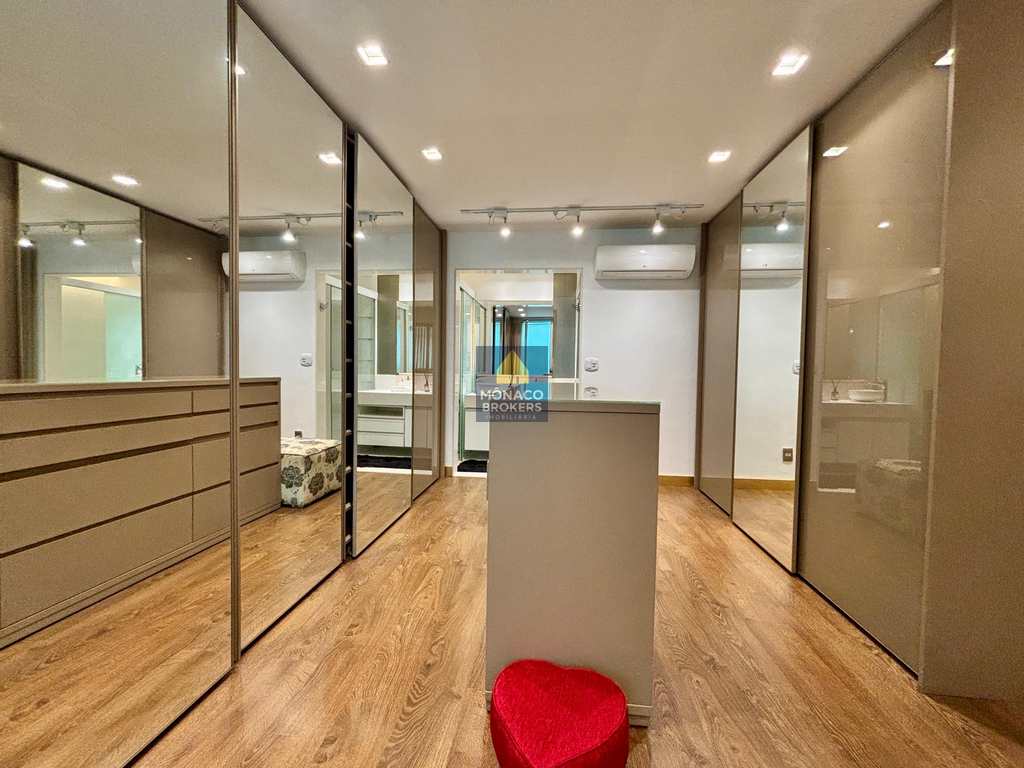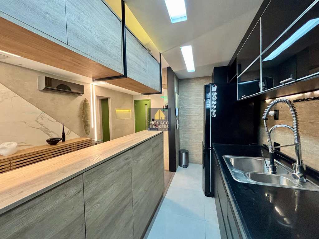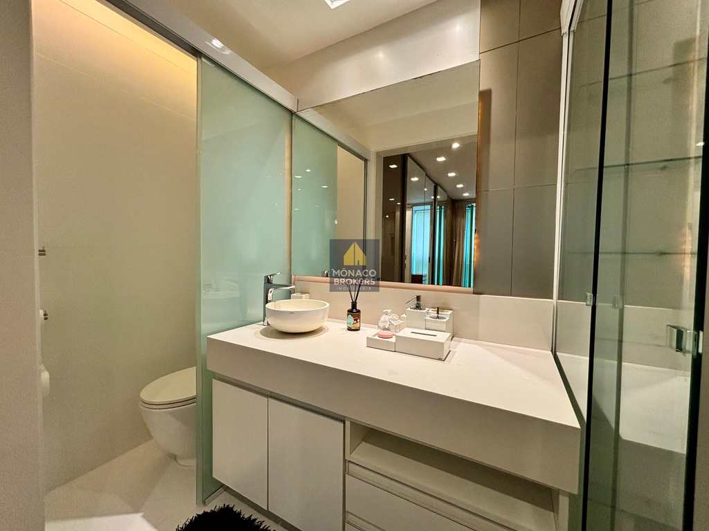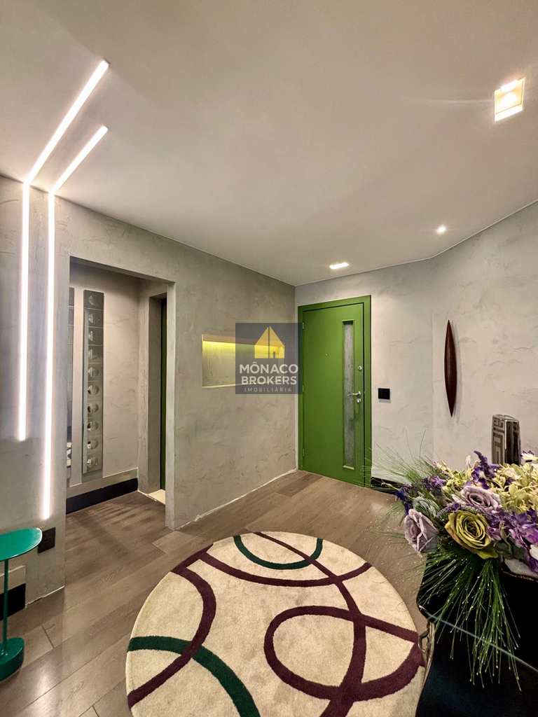 A marcenaria sob medida em alto padrão se harmoniza com a iluminação cuidadosamente planejada, destacando obras e peças assinadas que compõem a decoração. A cozinha moderna, equipada com eletros premium, traduz praticidade e beleza no dia a dia. E o lavabo… um verdadeiro charme, digno das melhores referências de interiores contemporâneos.